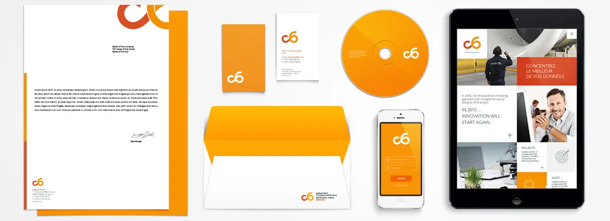 Identité graphique complète. Spécialisée dans la conception et l'édition de progiciels ECM, la société C6 a pour objectif de proposer des produits performants et faciles à utiliser, afin de répondre à des exigences métiers dont la complexité varie.