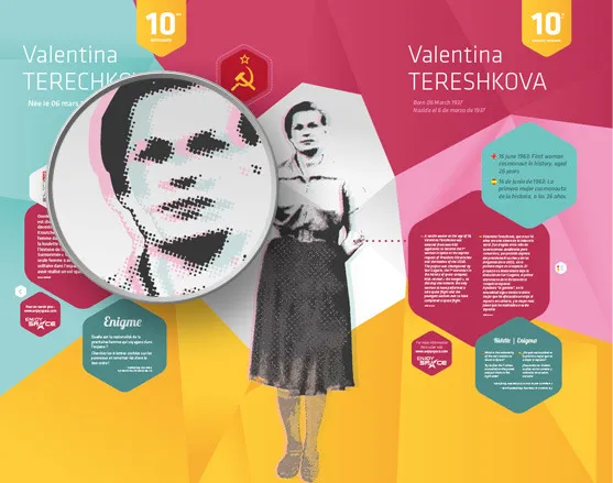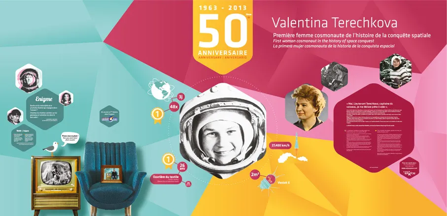 Design graphique de l'exposition temporaire "Valentina" de la Cité de l'espace, Parc de l'aventure spatiale à Toulouse. A l'occasion du cinquantenaire de la première femme dans l'espace (1963-2013), la Cité de l'Espace a créé cette exposition rendant hommage à Valentina Terechkova, qui fût la première, mais aussi à toutes les autres qui l'ont suivi depuis un demi siècle.