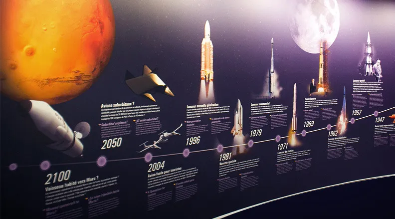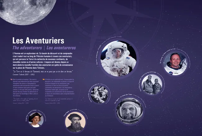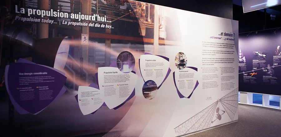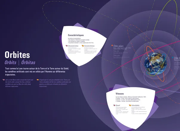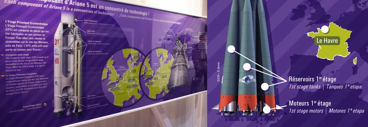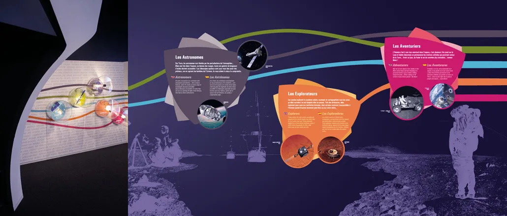 Design graphique des expositions permanentes de la Cité de l'espace, Parc de l'aventure spatiale à Toulouse. Sur plus de 600 m2, le Centre de lancement, propose de découvrir l'histoire, le fonctionnement et les caractéristiques des lanceurs spatiaux, depuis les premières fusées jusqu'aux lanceurs actuels et futurs.