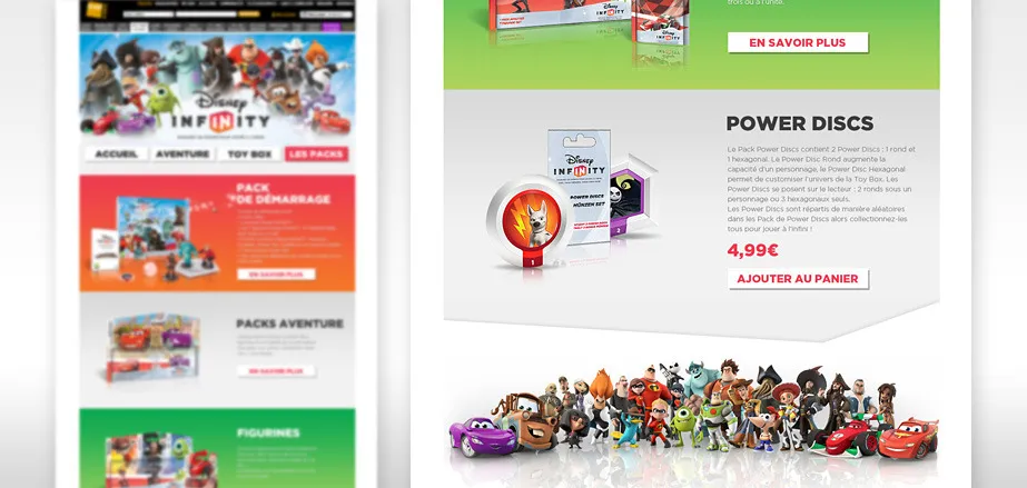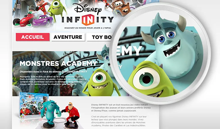 La Fnac et Disney nous ont confié la réalisation de ce minisite boutique à l'occasion de la sortie du jeu Disney Infinity. Comme dans le jeu réel, l'internaute choisi les figurines qu'il souhaite voir à l'écran en les posant sur le lecteur Disney Infinity, il découvre ainsi tous les univers du jeu : Pirates des Caraïbes, Monstres Academy, les Indestructibles, Cars et Lone Ranger. Le site comporte une boutique dédiée Disney Infinity présente l'ensemble des jeux, figurines, packs et powerdiscs.