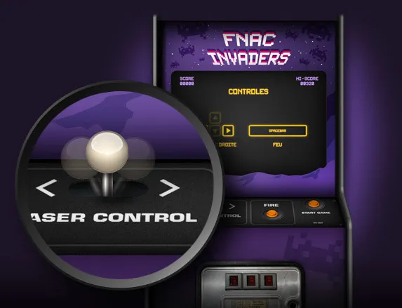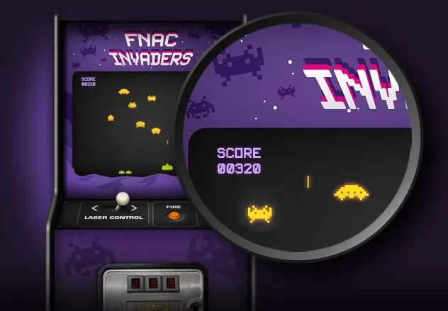 Pour cette opération spéciale la Fnac nous fait replonger aux racines du jeu vidéo avec cette adaptation d'un grand classique : Space Invaders ! Le design reprend l'ambiance borne arcade, pour un véritable mini jeu en ligne avec enregistrement des meilleurs scores pour tenter de gagner un des nombreux lots.