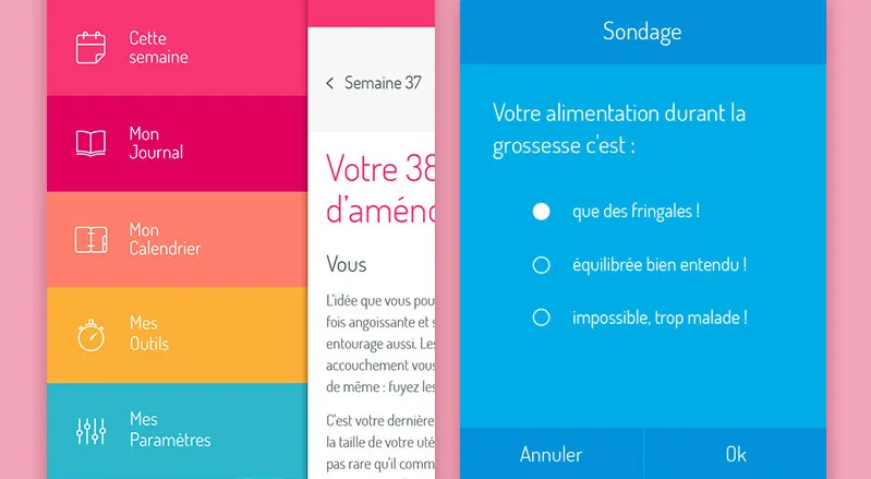 Cette App de suivi de grossesse permet d'avoir semaine par semaine des conseils et informations à propos de sa grossesse, d'enregistrer ses humeurs et moments clés dans son journal et suivre tous les événements importants du développement du bébé... Nous avons travaillé sur l'ergonomie et le design de l'application.