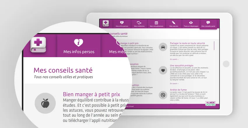 La Mutuelle des Etudiants (LMDE) a souhaité mettre à la disposition de ses adhérents un Carnet de Santé virtuel. Cet outil permet de gérer sa santé au quotidien : rendez-vous médicaux, vaccins, conseils... Cubedesigners s'est chargé de la réalisation complète de cet outil : design et développement. Projet réalisé en partenariat avec l'agence New BBDO.