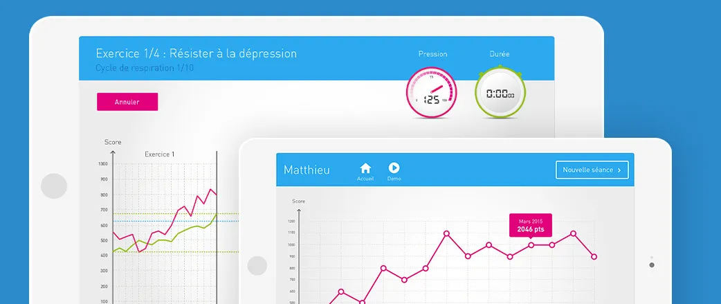 Cette App médicale est dédiée au Simeox, un appareil de désencombrement bronchique. L'App permet de faire ses séances de traitement, de voir en temps réel si l’exercice est bien réalisé et de suivre ses progrès d’une séance à l’autre. A l’hôpital, l’App permet de créer un compte pour chaque patient et d’assurer ainsi un suivi des traitements. Nous avons aussi créé un jeu à destination des enfants qui permet d’avoir une approche ludique du traitement. Nous avons entièrement réalisé cette App : ergonomie, design graphique, développement.