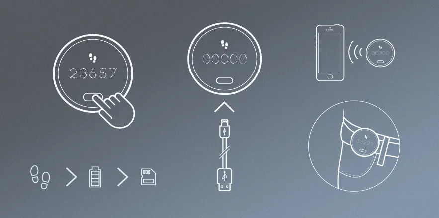 Sanofi souhaitait développer un podomètre aux données fiables, pouvant être porté quotidiennement, au bureau notamment. Nous avons travaillé sur différents systèmes d'accroche et retenu celui permettant un portage à la taille, zone la plus fiable pour la mesure de données. Nous avons réalisé un design simple et élégant, permettant de porter facilement le podomètre au bureau. Outre le design du produit, nous avons aussi réalisé le design de l'interface (affichage des données et icônes), ainsi que le design de la notice utilisateur.