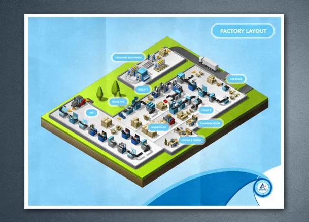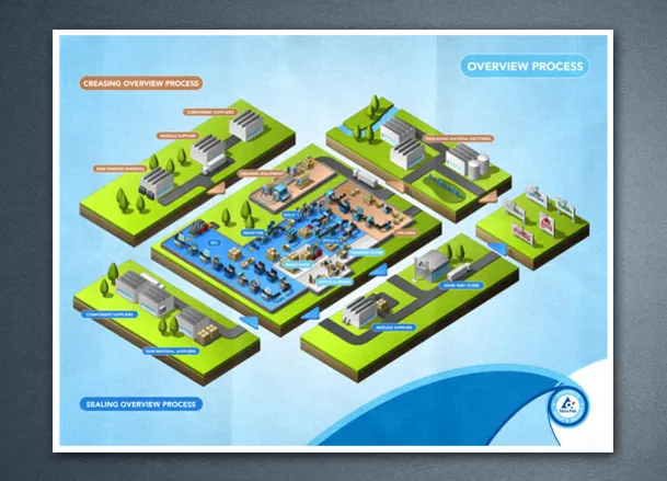 Réalisation d'une série de huit posters illustrant le process de fabrication d'une machine à emballer Tetrapak.
