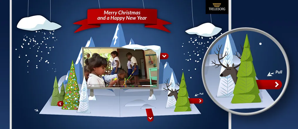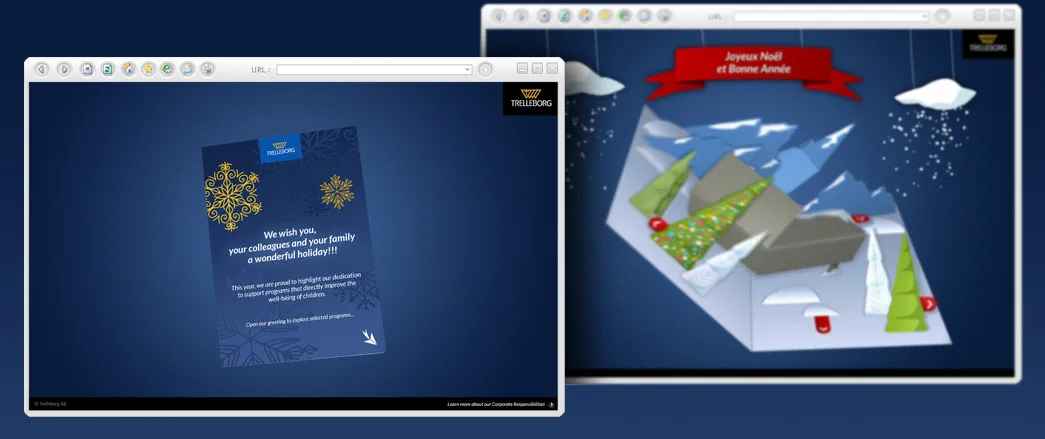 Trelleborg désirait souhaiter ses vœux tout en présentant les actions de sa fondation pour les enfants. Nous avons réalisé cette carte popup originale qui mixe ambiance de noël et vidéos de la fondation.