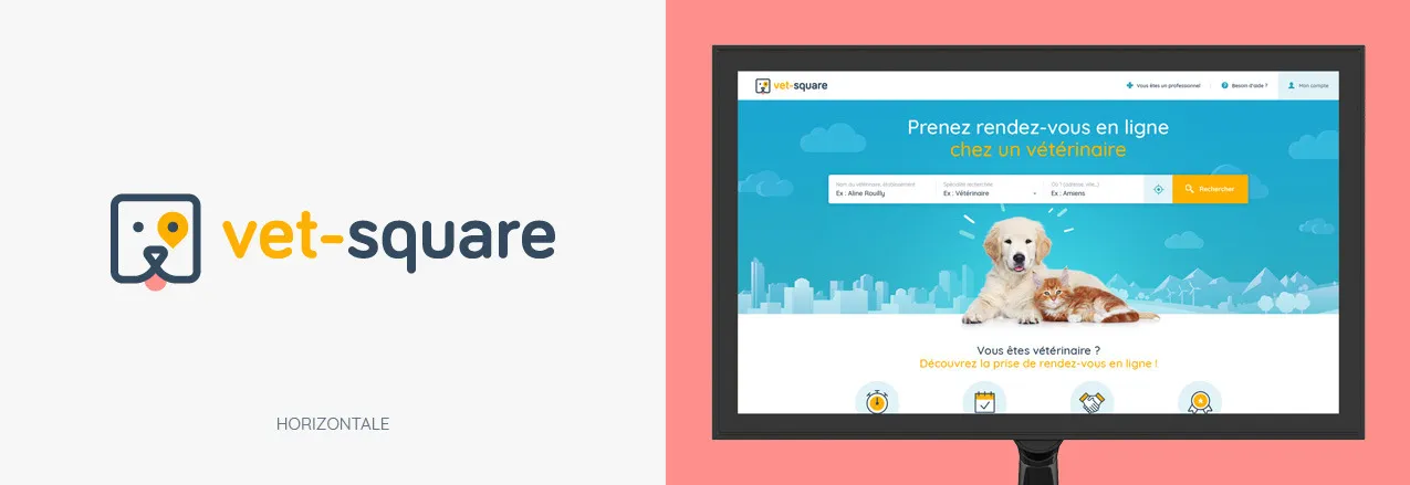Vet-square permet aux particuliers de trouver un vétérinaire et de prendre rendez-vous. Création du logo, de la charte graphique, et de l'ensemble de la communication Digitale.