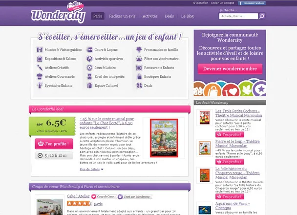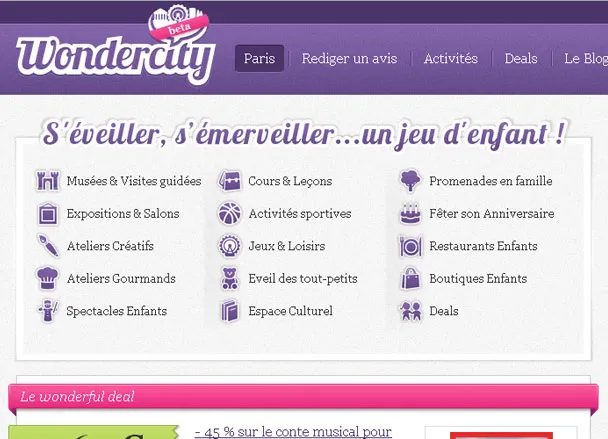 Wondercity est un site dédié aux parents, regroupant les meilleures activités pour occuper et éveiller ses enfants de 0 à 12 ans. Wondercity se positionne à l’intersection de 3 concepts forts sur Internet : le contenu, la communauté, le commerce.