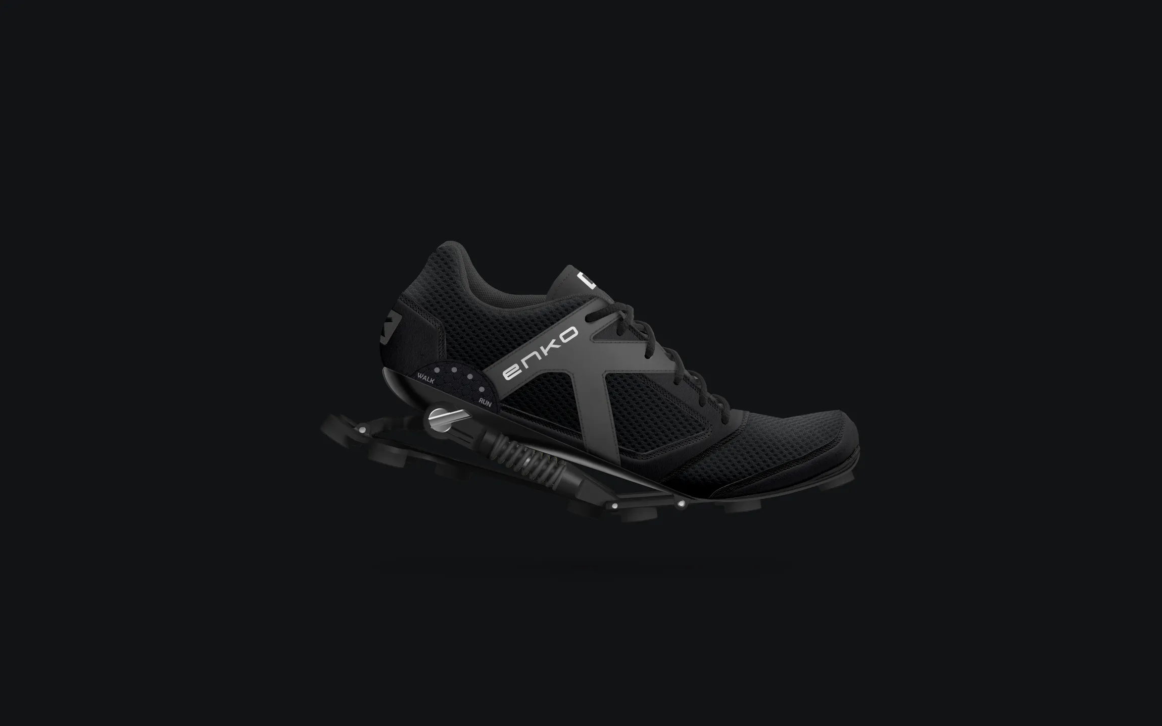 Pour le design de la chaussure, nous avons souhaité mettre en valeur son innovation principale : une semelle inédite, mécanique et articulée. Le design de la chaussure c’est donc fait autours de cette semelle, et des lignes qu'elle induit. L'amortisseur est ainsi très présent dans le design, ainsi que la manette permettant de passer de la position marche à la position course. Les bandes latérales sur la partie chaussante apportent un excellent maintient du pied tout en renforçant l'identité de marque avec le monogramme K et les diagonales de la marque. Les runnings Enko ont reçu le Label de l’Observeur du design 2016. L’Observeur du design est un prix international de design qui repère et récompense chaque année les réalisations les plus innovantes en terme de design et d'innovation.